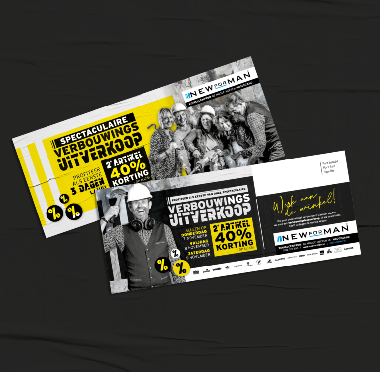 Er is werk aan de winkel, want New for Man gaat verbouwen! Maar voordat er geklust kon worden, moest er ruimte gemaakt worden in de winkel. Oftewel, de winkel moest leeg. We ontwikkelden een verbouwingscampagne die een paar maanden ingezet werd. De campagne bestond uit verschillende fases, met nieuwe acties en een nieuwe uitstraling.